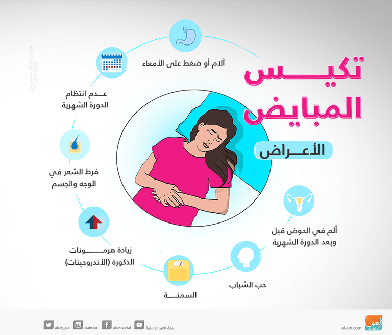 تكيس المبايض هو اضطراب هرموني شائع بين النساء في سن الإنجاب يسبب مشاكل في المبايض. السبب الدقيق له غير معروف لكن قد تسهم العوامل الوراثية والبيئية في تطوره. الطمث غير المنتظم، نمو شعر غير مرغوب فيه، وحَبُّ الشباب من أهم أعراضه. التشخيص المبكر مهم؛ لأنه يمكن أن يسمح بإدارة الأعراض، وقد يمنع تطور مشاكل صحية طويلة. النظام الغذائي، ممارسة النشاط البدني والأدوية يمكن أن تساعد في السيطرة على الأعراض. تعريف المرض: هو اضطراب هرموني شائع بين النساء في سن الإنجاب، عادة ما يبدأ عند البلوغ، وهو عبارة عن مجموعة من الأعراض المتعلقة باختلال التوازن الهرموني الذي يسبب مشاكل في المبايض، مما يؤدي إلى عدم تطور البويضة كما يجب، أو لا تطلق أثناء فترة التبويض.